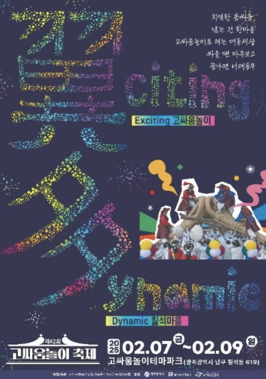 ๊ด์ฃผ ๊ณ ์ธ์๋์ด ์ถ์ ๋ ๋จ์ํ ์๊ฒ์ ์ฌํํ๋ ๋ฐ ๊ทธ์น์ง ์๊ณ , ์ฐ๋ฆฌ ๊ณ ์ ๋ฌธํ์ ์ฐ์์ฑ์ ๋ฏธ๋ ์ธ๋์๊ฒ ์๋ฆฌ๊ณ , ๋ชจ๋๊ฐ ํจ๊ป ์ฆ๊ธฐ๋ฉฐ ์ํตํ๋ ์ฅ์ ๋ง๋๋ ๋ฐ ํฐ ์๋ฏธ๋ฅผ ๋๊ณ ์์ด์. ์ ์น์๋ฟ๋ง ์๋๋ผ ์ง์ญ ์ฃผ๋ฏผ, ๊ทธ๋ฆฌ๊ณ ๊ด์ฃผ ์๋ฏผ ๋ชจ๋๊ฐ ํ๋ฐ ์ด์ฐ๋ฌ์ ธ ์ ํต ๋ฏผ์๋์ด๋ฅผ ์ฆ๊ธธ ์ ์๋ ๋ฉ์ง ๊ธฐํ๋๋๋ค. ๊ณ ์ธ์๋์ด๋ ๋ ๊ฐ์ ํฐ '๊ณ '๊ฐ ์๋ก ๋ง๋ถ์ด ํ์ ๊ฒจ๋ฃจ๋ ๋์ด๋ก, ์ด ๊ณผ์ ์์ ๋ง์ ์ฌ๋๋ค์ ์์ฐ์ค๋ฝ๊ฒ ํ๋์ฌ๊ณผ ๋จ๊ฒฐ์ฌ์ ํค์ฐ๊ฒ ๋ผ์. ๋ง์น ํ๋์ ํ์ด ๋์ด ๋ชฉํ๋ฅผ ํฅํด ๋์๊ฐ๋ ๊ฒ์ฒ๋ผ ๋ง์ด์ฃ . ์ถ์ ๊ธฐ๊ฐ ๋์์๋ ๊ณ ์ธ์๋์ด ์ธ์๋ ์ค์ง์ด๊ฒ์, ์ฌ๋ฌผ๋์ด, ํผ๋ ์ด๋, ๋ฌ์งํ์ฐ๊ธฐ, ๋ถ๊ฝ๋์ด ๋ฑ ๋ค์ฑ๋ก์ด ๋ณผ๊ฑฐ๋ฆฌ์ ์ฆ๊ธธ ๊ฑฐ๋ฆฌ๊ฐ ์ค๋น๋์ด ์์ด์, ๋จ๋ ๋ ธ์ ๋๊ตฌ๋ ์ฆ๊ฑฐ์ด ์๊ฐ์ ๋ณด๋ผ ์ ์์ ๊ฑฐ์์. ํนํ, ์ถ์ ๊ธฐ๊ฐ์๋ ๋จน๊ฑฐ๋ฆฌ ์กด๋ ์ด์๋๋, ๋ง์๋ ์์๊ณผ ํจ๊ป ์ถ์ ์ ํฅ๊ฒจ์์ ๋ง๋ฝํ ์ ์๋ต๋๋ค. ๋ค๋ง, ์ ๋ ์๊ฐ๋์๋ ๋ ์จ๊ฐ ์์ํ ์ ์์ผ๋ ๋ชจ์, ์ฅ๊ฐ, ๋ชฉ๋๋ฆฌ, ๋ง์คํฌ ๋ฑ์ ์ฑ๊ฒจ ๋ฐ๋ปํ๊ฒ ์ ๊ณ ์ค์๋ ๊ฑธ ์ถ์ฒ๋๋ ค์.