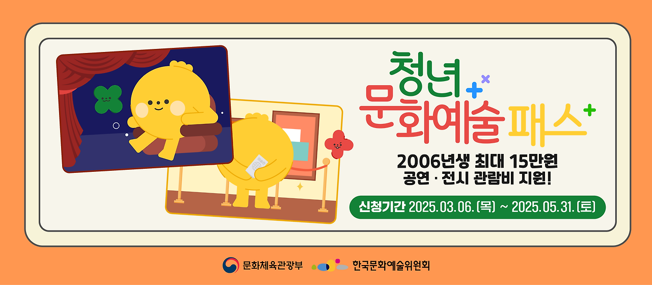 2025๋ ์ฒญ๋ ๋ฌธํ์์ ํจ์ค ์ ์ฒญ์ 2025๋ 3์ 6์ผ๋ถํฐ ์์ํด์ 5์ 31์ผ๊น์ง ์งํ๋ ์์ ์ ๋๋ค. ๋๋ํ ๊ธฐ๊ฐ์ด์ง๋ง, ์๋๋ฅด๋ ๊ฒ ์ข๊ฒ ์ฃ ? ์ ์ฒญ์ ์จ๋ผ์ธ์ผ๋ก ๊ฐ๋จํ๊ฒ ํ ์ ์์ต๋๋ค. '์ฒญ๋ ๋ฌธํ์์ ํจ์ค ๋๋ฆฌ์ง' ํํ์ด์ง์์ ์ ์ฒญํ๋ฉด ๋ฉ๋๋ค.