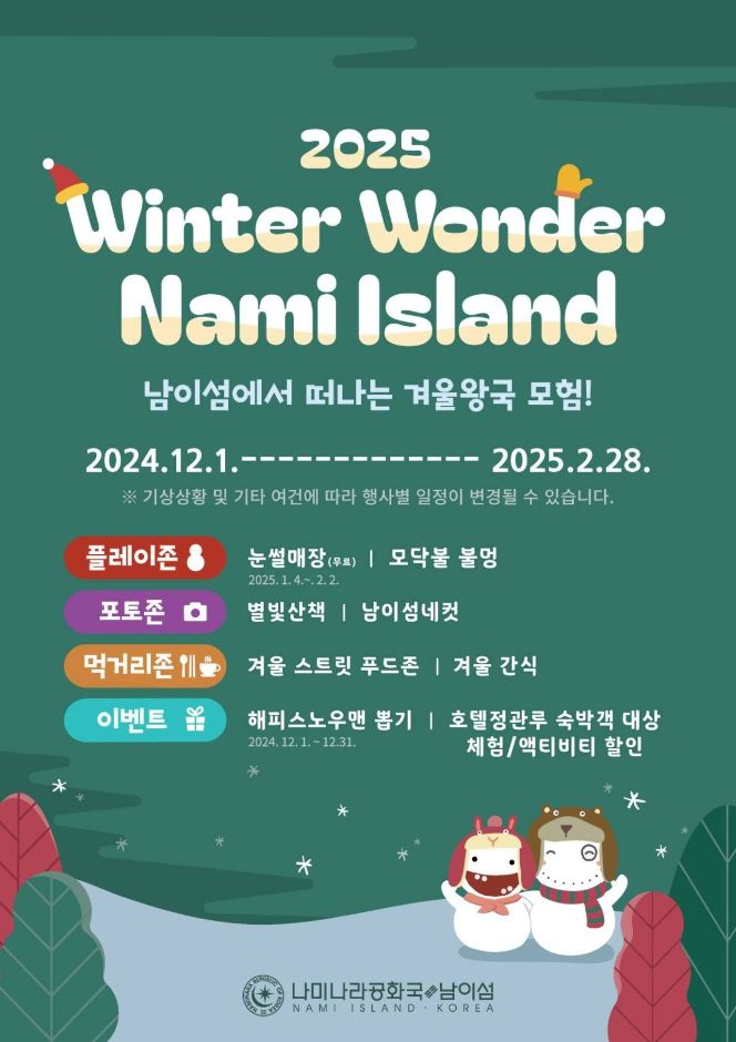 ๋‚จ์ด์„ฌ์˜ ๊ฒจ์šธ ํ’๊ฒฝ๊ณผ ํ•จ๊ป˜ ์ฆ๊ธฐ๋Š” 'Winter Wonder Nami Island'์—์„œ ํŠน๋ณ„ํ•œ ๊ฒจ์šธ ์ถ”์–ต์„ ๋งŒ๋“ค์–ด๋ณด์„ธ์š”. ๋ˆˆ์ฐ๋งค, ๊ฒจ์šธ ๊ฐ„์‹, ๊ทธ๋ฆฌ๊ณ  ์•„๋ฆ„๋‹ค์šด ๋น›์˜ ์ •์›์ด ์—ฌ๋Ÿฌ๋ถ„์„ ๊ธฐ๋‹ค๋ฆฝ๋‹ˆ๋‹ค!